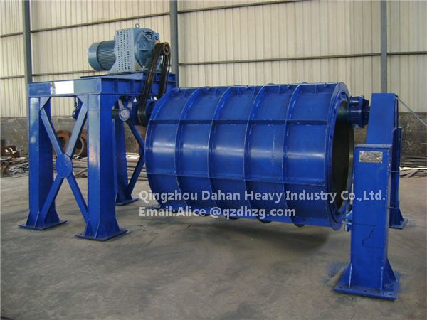 This machine uses the Roller to support the concrete pipe mould, and produce the roller force to concrete in the mould. When the roller rotate at a high speed, the concrete in the mould will spread in the inner wall of the pipe mould and form a cement pipe with the centrifugal force, and when the mould with the inner concrete pass on the roller, the concrete between the mould and the roller will be compacted solid to form a pipe.